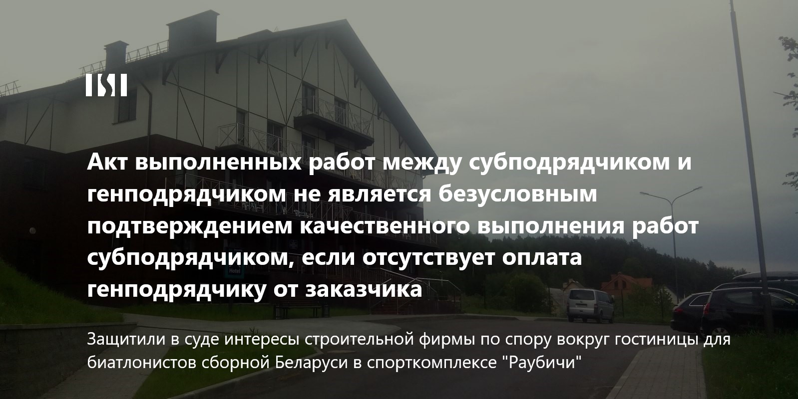 Судебная практика пошла по такому пути, что если отсутствует оплата генподрядчику от заказчика, то акт выполненных работ между субподрядчиком и генподрядчиком не является безусловным подтверждением того, что работы выполнены качественно. Следовательно, генподрядчик пытался подтвердить отсутствие оплаты от заказчика-спорткомплекса «Раубичи» (который, в свою очередь, представил в суд подтверждение того, что оплатил генподрядчику всю сумму за выполненные работы) тем, что якобы вернул заказчику выплаченные деньги, что подтвердил платежным поручением. Принятие судом данного довода позволило бы генподрядчику заявить ходатайство о проведении экспертизы работ нашего клиента, итог которой предугадать всегда очень сложно. Однако, Данила Смольский заявил ходатайство об истребовании банковских выписок по счетам генподрядчика и заказчика подтвердившее, что возврат денег от генподрядчика заказчику был фиктивный. Данные деньги были возвращены генподрядчику заказчиком как ошибочно зачисленные на основании письма генподрядчика. Следовательно, было доказано, что акт выполненных работ между генподрядчиком и нашим клиентом являлся подтверждением качественно выполненных работ, подлежащих оплате.